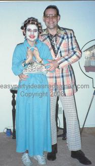 Bring out your inner nerd! This nerd and his wife costumes were easy to make. For her - curlers, a face mask (actually used makeup to look like a mask) a bathrobe and old tennis shoes. For him, a leisure suit found at the thrift store and glasses with tape in the center.
