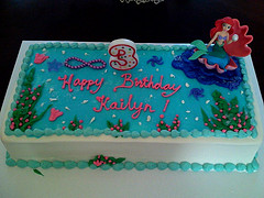 For a mermaid theme cake, you can make a rectangular sheet cake (or any shape you wish, really), and cover with blue icing on the top for water. In one corner, make a “mound” or “hill” out of cake, frost in chocolate to look like a rock, and stick an inexpensive Barbie type doll with flowing red hair into this. Draw a mermaid tail on the "rock" with green icing.